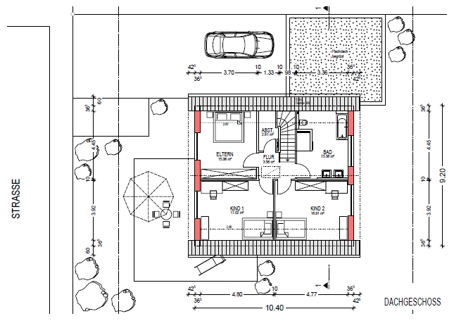 Satteldach, 38° + Querbau mit Flachdach